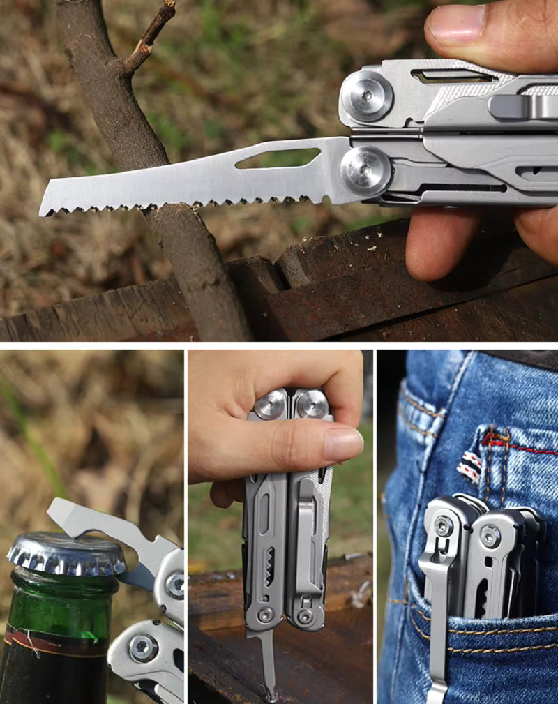 Ten niezwykle praktyczny multitool łączy w sobie solidną konstrukcję ze stali nierdzewnej oraz szeroki zestaw funkcji, które sprawdzą się zarówno w terenie, jak i w codziennych sytuacjach. To narzędzie stworzone z myślą o osobach, które chcą mieć wszystko pod ręką – niezależnie od tego, czy są na biwaku, w pracy, czy wykonują drobne naprawy w domu.